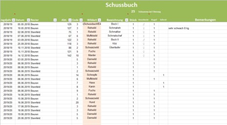 Diese Seite stellt Ihnen mein digitales Jagdtagebuch vor. Sie können sich die Beispielsdatei und/oder die Vorlage herunterladen. Beide Dateien können Sie nach Ihren Vorstellungen und Wünschen unbeschränkt bearbeiten. Die erste Downloaddatei beinhaltet die Beispielsanwendung die zweite ist eine Blanko-Vorlage. Viel Spaß bei der Anwendung!